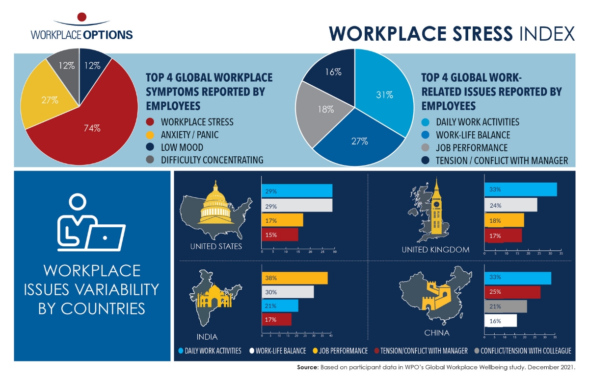 WPO 工作场所压力指数将员工引用的全球四大工作相关问题排名如下: